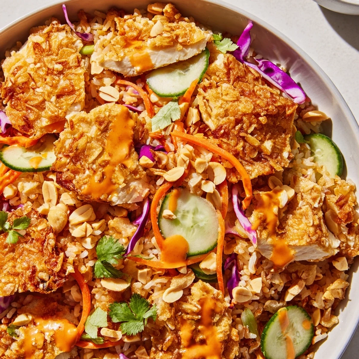 I discovered this salad on a whim during a heatwave when cooking anything hot felt impossible, yet I still wanted something satisfying for dinner. The combination of crispy rice cakes from my local Asian market and leftover grilled chicken became the starting point. Now it is the dish I turn to when I need serious texture and flavor but cannot bear a heavy meal.