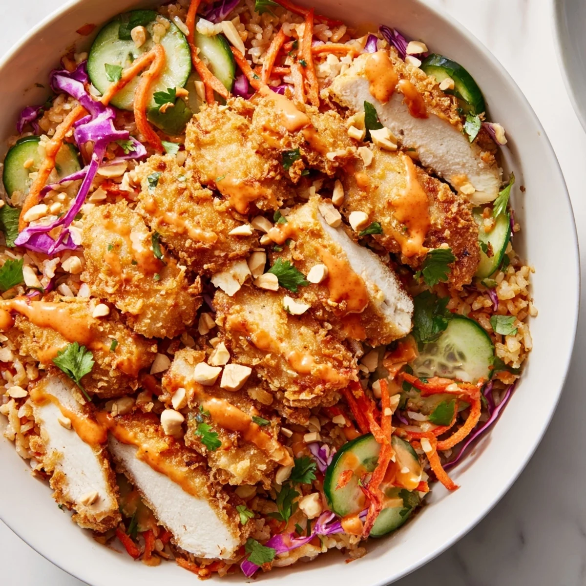 This vibrant bowl brings together tender marinated chicken, golden crispy rice squares, and crisp fresh vegetables. The signature Bang Bang sauce—creamy mayonnaise blended with sweet chili heat, Sriracha kick, and bright lime—ties everything together. Roasted peanuts and sesame seeds add the final crunch. Perfect for warm weather dining or meal prep lunches that stay satisfying for days.