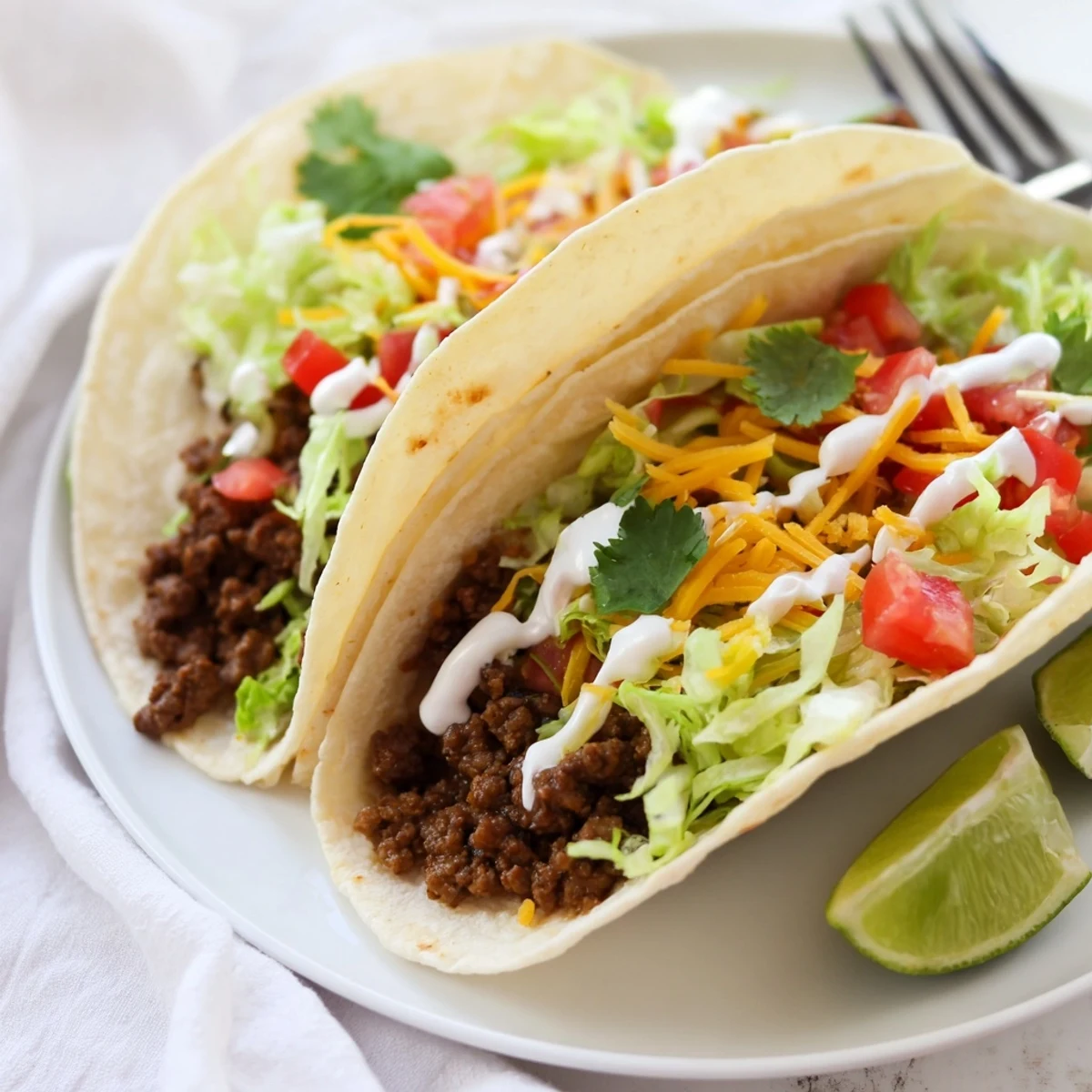 Sauté onion and garlic in olive oil, then brown ground beef and season with chili powder, cumin, smoked paprika, and oregano. Simmer with tomato paste and broth until thickened. Warm flour tortillas and assemble with the seasoned beef, then top with lettuce, tomatoes, cheddar cheese, sour cream, cilantro, jalapeños, and lime. Ready in 40 minutes, serving four.