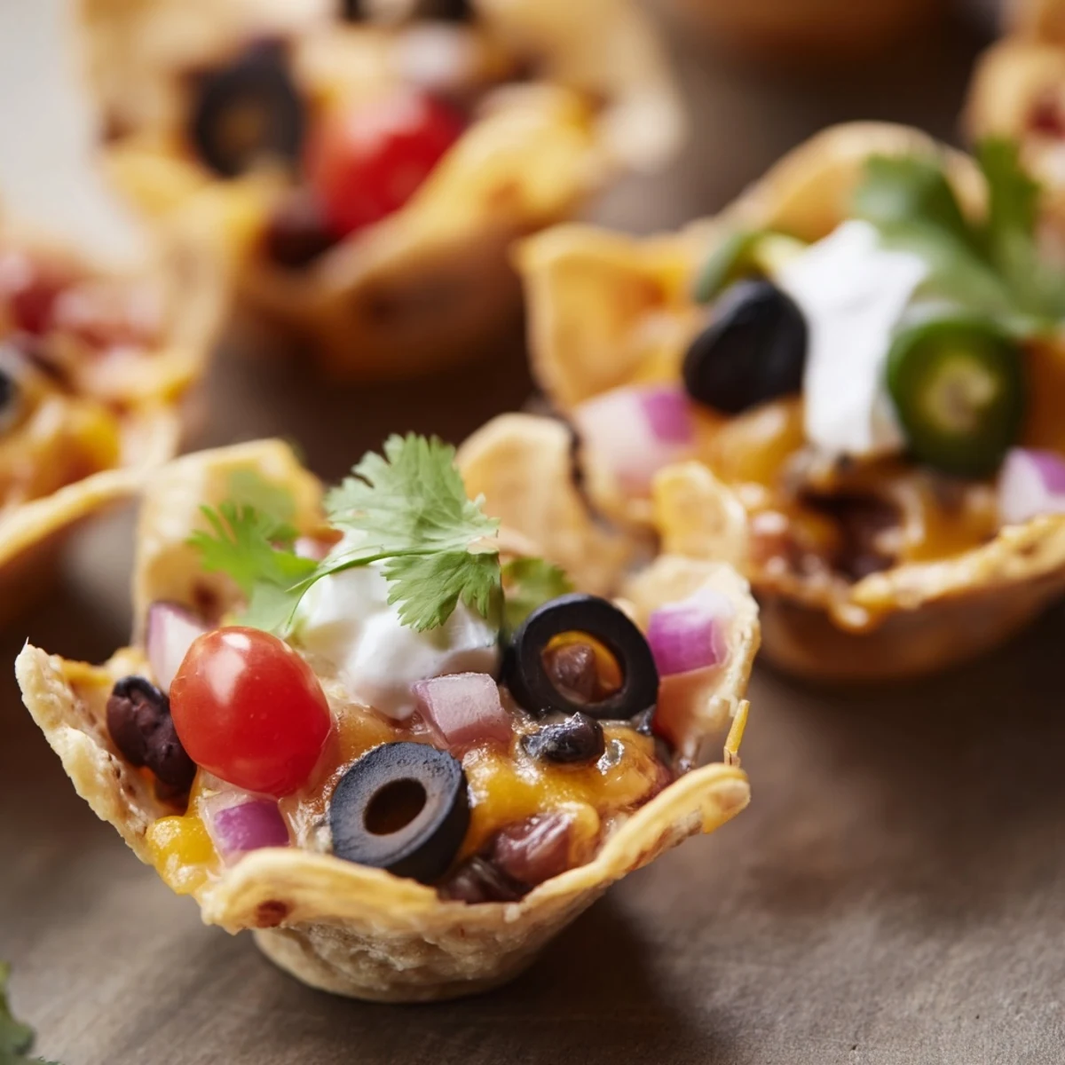 These miniature nacho cups transform classic tortilla chips into edible vessels for melty cheese and colorful toppings. Each crispy shell holds a generous layer of shredded cheddar and Monterey Jack, topped with black beans, juicy cherry tomatoes, briny black olives, and spicy jalapeño slices. They bake in just 10 minutes until the cheese bubbles and turns golden. The finished cups get a cool contrast from sour cream and fresh cilantro, plus optional salsa or guacamole for dipping. Perfect for feeding a crowd during football season or casual get-togethers.